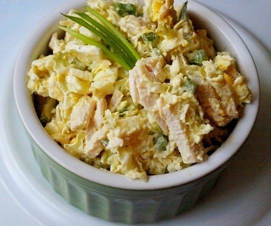 Такой салат получается очень вкусным и легким, а самое главное, 10 минут — и у вас готово шикарное блюдо. Ингредиенты: Пекинская капуста 300 г помидор 2 шт колбаса копченая 100 г яйца вареные 2 шт кукуруза 100г укроп майонез соль и перец по вкусу батон 4 кусочка Капусту вымыть, обсушить, порезать, помять с солью. Помидоры, яйца, колбасу, зелень порезать. Добавить кукурузу. Батон порезать кубиком, подсушить на сковороде. Перемешать все ингредиенты, кроме сухариков, посолить, поперчить, заправить майонезом. При подаче посыпать сухариками. Приятного аппетита!5. Салат из пекинской капусты с курицей
