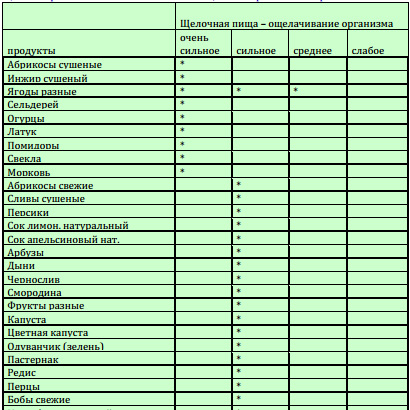 Итак, рассмотрим таблицу щелочных продуктов по степени ощелачивания: