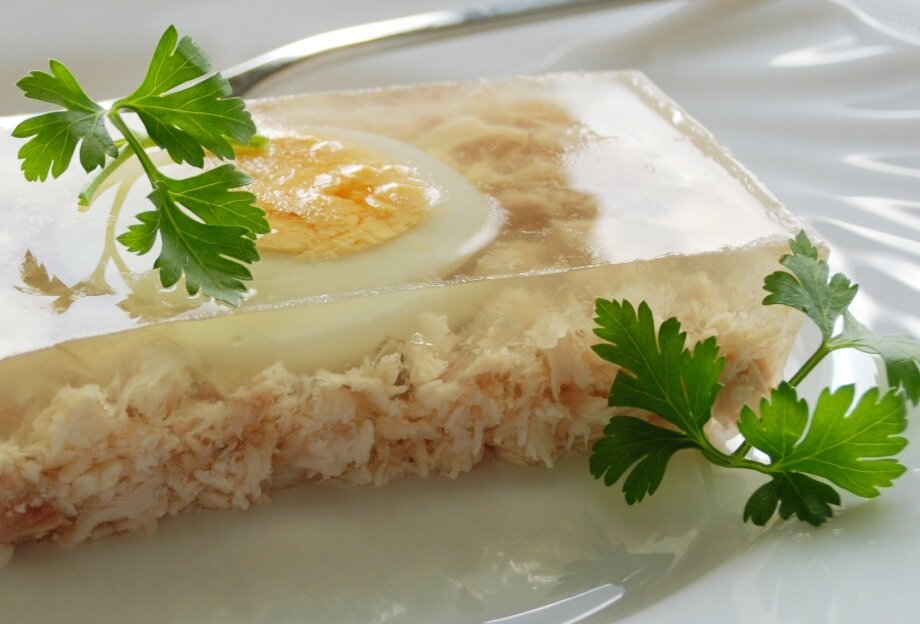 Белок коллаген представляет собой спиральные нити, которые скручиваются между собой и образуют достаточно твердую ткань (вспомните, как тяжело жуются хрящи) — именно этот компонент и способствует застыванию бульона в желе.