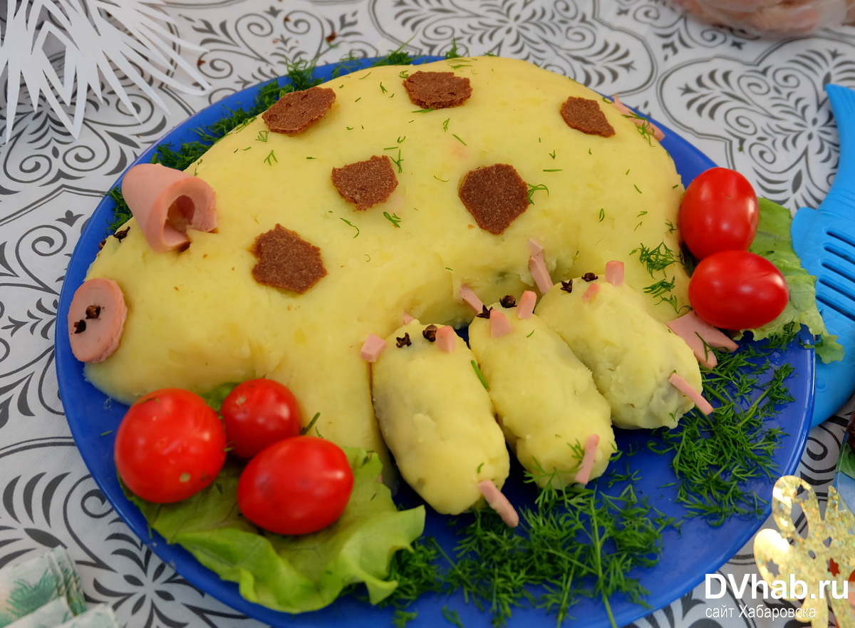 Готовить по базовому рецепту можно и праздничное картофельное пюре, однако украсить его придется по-особенному. Предложим лишь два варианта: превратить горку пюре в вулкан (огненную лаву с легкостью заменит томатный соус), или сделать «паутинку» и поселить на ней миниатюрного паучка.
