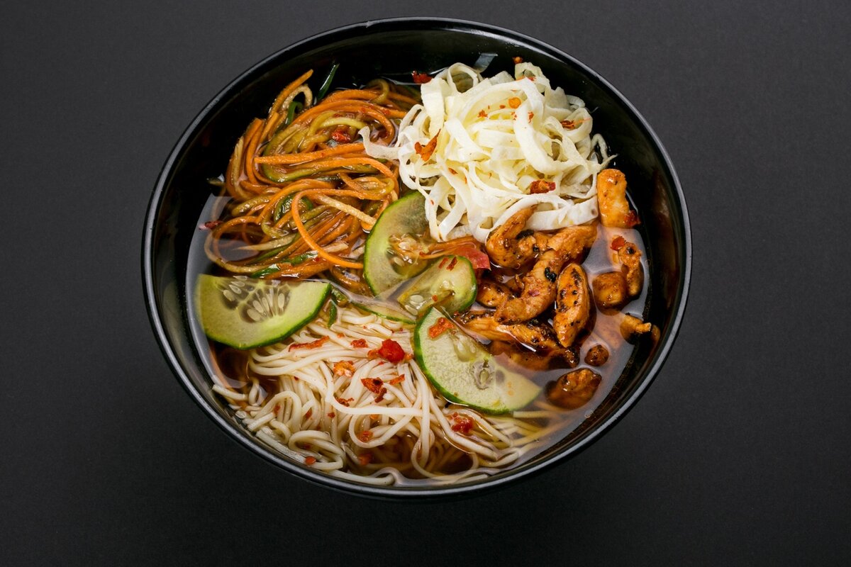 9.В порционную тарелку положить лапшу, по кругу выложить подготовленную капусту, жаренные лук и сладкий перец, яичные блинчики, нарезанные лапшой, мясо и салат из огурцов, добавить бульон и сверху посыпать колечками перца чили и кунжутом.