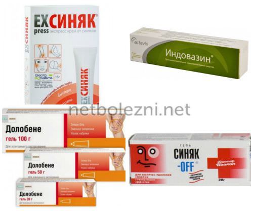 Существует множество мазей и гелей, которые используются от синяков под глазами и гематомах на других частях тела. Мазь от синяков используется для уменьшения последствий ушибов, улучшения внешнего вида и недопущения долгосрочных негативных эстетических эффектов.