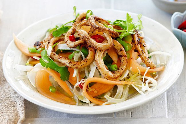 Кальмары славятся не только приятным и мягким вкусом, но и своими полезными свойствами. В мясе кальмаров содержится большое количество белка, который прекрасно усваивается организмом. Также оно богато витаминами B1, B3, B4, B5, B6, B9, B12, C и Е.Что касается микроэлементов, то кальмары содержат много калия и магния. Недаром на востоке кальмары называют «бальзамом для сердца«. Также они не содержат насыщенные жирные кислоты. Поэтому людям, с повышенным уровнем холестерина, врачи рекомендуют употреблять этот морепродукт регулярно. В кальмарах большое количество таурина – вещества, которое способствует выведению вредного холестерина.
