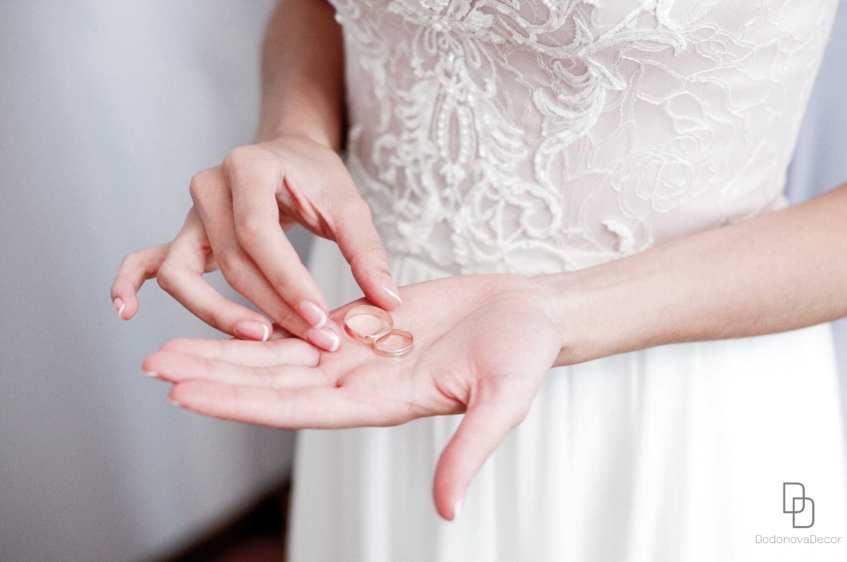 Нельзя в день свадьбы одевать на руку кольца, кроме обручального.