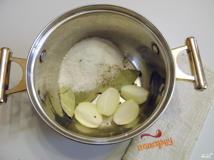 - Приготовьте маринад. Влейте в кастрюлю 1 литр воды и поставьте на огонь. Добавьте соль, сахар и специи, доведите до кипения и варите 15 минут.