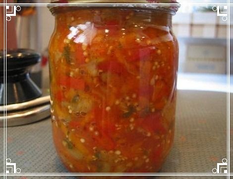 10.Горячий готовый овощной салат раскладываем по подготовленным банкам. Вливаем в каждую банку уксус. Банки закупориваем, утепляем и остужаем. Храним овощной салат в прохладном месте