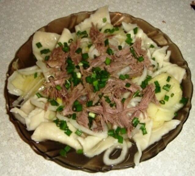 Классический рецепт Бесбармака — это обычно отваривание бульона из нескольких видов мяса (конина, баранина, говядина и верблюд) и пасты прямоугольной формы.