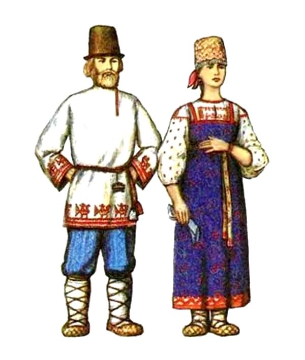 Русский традиционный костюм начал складываться в XII — XIII веках, и до начала XVIII века носили цари и князья, бояре и купцы, ремесленники и крестьяне. Женский силуэт в традиционной культуре до середины ХХ века оформлялся прямоугольным поневным (южным) и треугольно-трапециевидным сарафановым (северорусским) комплексами. Мужская одежда и на юге, и на севере России была гораздо более однородной и менее женской: рубахи-косоворотку подвязывали пояс «под пузом» и производили поверх узких, залитых в сапоги штанов-портов.Сами формы одежды (соотношение цветов) естественно соответствуют определенному антропологическому типу: русоволосые и светлоглазые северянки в праздничном костюме предпочитают гамму пастельных и вытянутых форм, темноволосые и темноглазые южане оперируют контрастной черно-белой и красной палитрой.