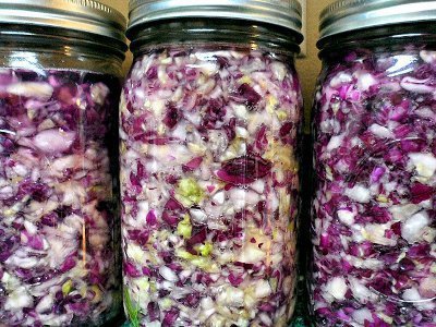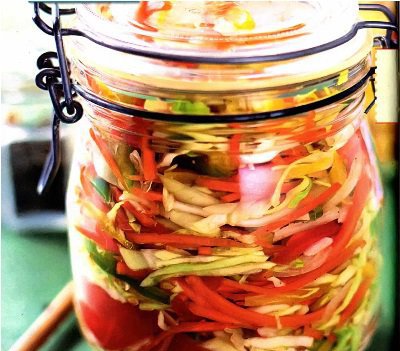 - В-шестых, при мариновании капусты на зиму, кроме моркови и яблок, можно использовать самые разнообразные овощи и фрукты: клюкву, бруснику, сливу, свеклу, лук и болгарский перец.