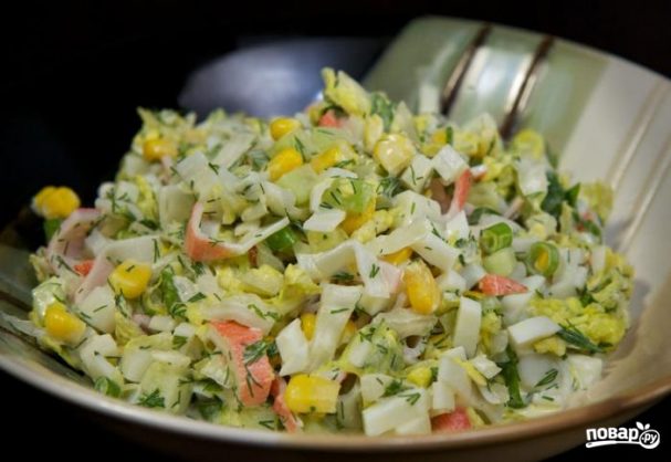Рецепт 4. Салат с капусты, кукурузы и крабовыми палочками