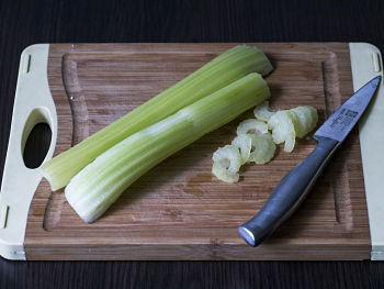 Стебли сельдерея сполоснуть, нарезать полукольцами.