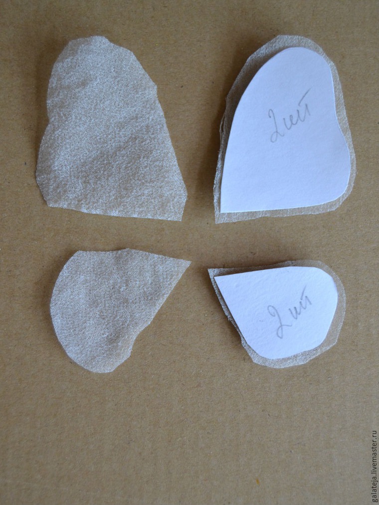 2Справа в кадр попал кусочек вуали, как раз видно, как нужно выкраивать крылышки. При такой раскладке, они получаются по косой нитке — что нам и требуется для наилучшей обработки горячим инструментом. Можно сразу же выкроить еще 2 детали №2 из микро-вуали, хотя бы одну из них лучше сделать сплошной, без прорезей (можно и обе). - Приступим к булению.