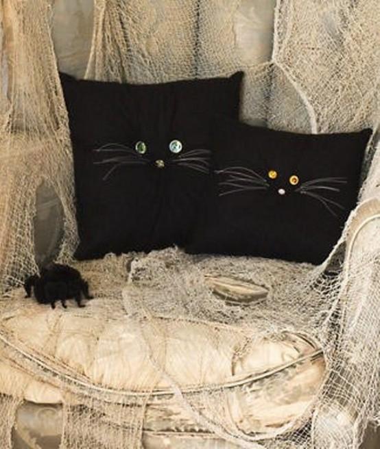 Мягкий декор должен вызывать улыбку, особенно для винтажных мотивов, поэтому диванных мяукающих аксессуаров переместите в кресло, драпированное искусственной паутиной в виде дымчатой сетки.