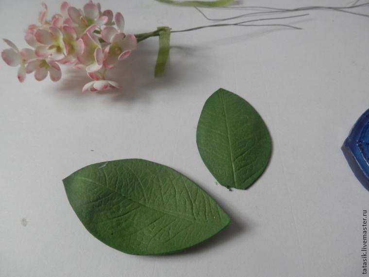 - Для дальнейшей работы лепестки необходимо нагревать, в результате термического воздействия материал становится податливым. Один из способов нагрева – прикладывание к поверхности утюга, другой – обработка феном. На нагретый лепесток наносим природную текстуру, для этого используем тупой нож или подходящую стеку. Делаем глубокую линию по центру, чтобы получилась заметная прожилка.