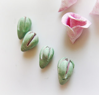 В получившийся чашелистик аккуратно вставляем запеченную заготовку цветочка (или бутона). Приглаживаем лепестки чашелистика плотно к цветку, устраняем все дефекты и неровности.Этот же метод применяем и при изготовлении бутонов, только разрезаем с толстой стороны "капли", а лепестки не раскатываем совсем.