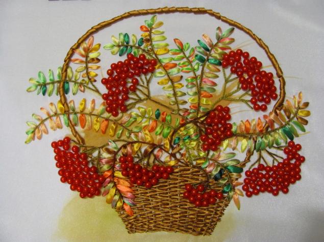 - Картины с корзинами из ленты — атласной или капроновой, выполняются своими руками по стандартной схеме плетения. Основа делается на базе стежков — как ленточных, так и из нитей.
