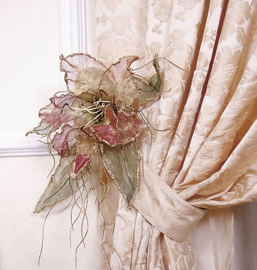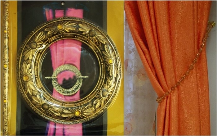 Каким будет зажим – лаконичным и простым, шикарным, настоящим произведением искусства – зависит от способностей хозяйки. Главное, чтобы аксессуар гармонично перекликался с другими деталями, используемыми для декора помещения.