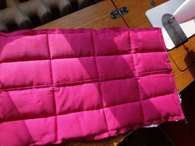 Сострочила вместе подкладку и основную ткань с 3-х сторон. Одну длинную сторону не соединяла. Через нее будем потом вставлять прокладку.