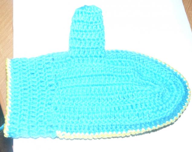 Теперь обвязываем нашу дырочку для пальчика, также, столбиками с накидом, по кругу, до нужной длины. В последнем ряду провязываем каждые два столбика вместе, стягиваем.