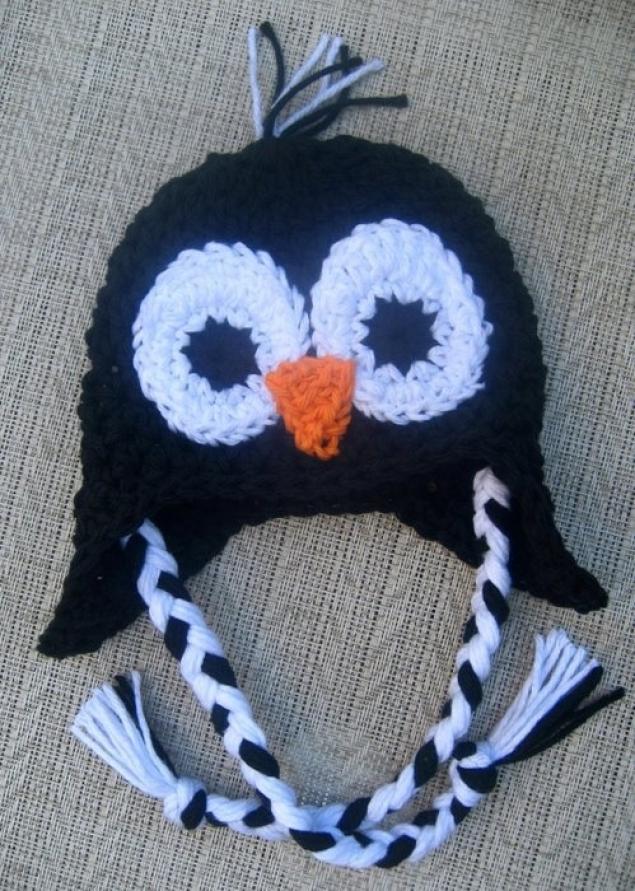 Сшиваем шапочку аккуратным швом. Изготавливаем 2 косички из 3-х прядей. Каждая прядь — из 13-ти нитей. Длина косички в готовом виде — 13см. Пришиваем косички к основаниям ушек. Изготавливаем кисточку высотой 6см. Пришиваем ее на макушку шапки.