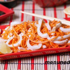 - Смешиваем морковь, приготовленную по-корейски, кальмары, лук.