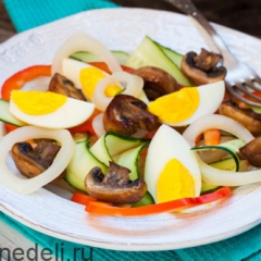 В этом салате два ярких продукта, это кальмар и грибы. Не смотря на это они не портят вкус салата, а даже наоборот, они гармонично соседствуют! ...далее