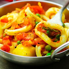 9. Не так быстро, но довольно просто приготовить оригинальные тушеные кальмары по-гречески. Очистите, промойте и нарежьте небольшими кусочками один килограмм кальмаров. Поместите кальмары в глубокую сковороду, добавьте две измельченные красные луковицы, половинку палочки корицы, три бутона гвоздики и два лавровых листа. Накройте сковороду крышкой и поставьте на 10 минут на средний огонь. За это время кальмары и лук выпустят свой сок. Затем снимите крышку и дайте выпариться почти всей жидкости. Удалите целые специи. Влейте два стакана сухого красного вина, 4 ст. ложки оливкового масла, 2 ст. ложки красного винного уксуса, добавьте щепотку черного перца и соль по вкусу. Накройте сковороду крышкой и тушите кальмары в течение одного часа, периодически помешивая. Снимите крышку и дайте соусу загустеть в течение 10 минут. Подавайте поверх отварного риса.