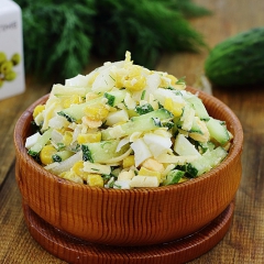 - Яйца взбейте, посолите и приготовьте на сковороде омлет. Остудите его и нарежьте соломкой. Если у вас нет времени готовить омлет, возьмите отварные яйца и мелко их порубите.
