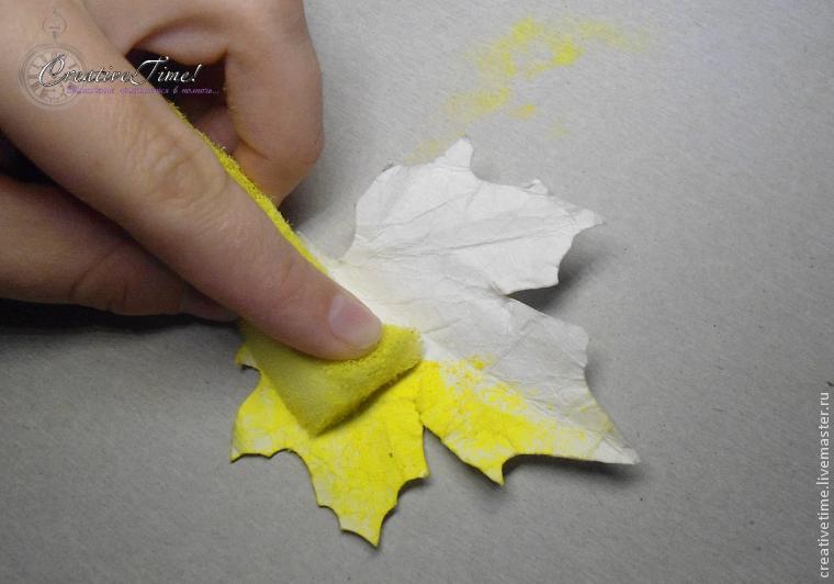 6. Макаем кусочек губки в желтую краску (прям так без воды) и причпокиваем всю поверхность листа, чтоб он стал желтеньким. Красим с обеих сторон.