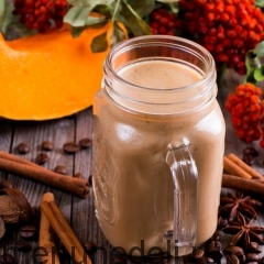Тыква — 200 г (или 4 ст.л. тыквенного пюре)Молоко — 250 мл Кофе натуральный — 120 мл Сахар — 1 ст.л. Ванилин — 1 щепотка (-и) Корица — 0.5 ч.л. Орех мускатный — 0.25 ч.л. Вода — 2 ст.л.