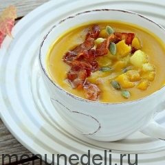 Тыква — 1 кг Картофель — 1 шт. Морковь — 2 шт. Лук репчатый — 1 шт. Чеснок — 1 зуб. Масло сливочное — 20 г Бульон — 750 мл Бекон — 70 г Яблоко — 2 шт. Сок лимонный — 2 ч.л. Карри — 1 ч.л. Масло оливковое — 2 ст.л. Семечки тыквенные — 1 ст.л. Соль — по вкусу