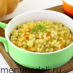 Крупа перловая — 200 г Вода — 600 мл Тыква — 270 г Лук репчатый — 220 г Морковь — 200 г Масло подсолнечное — 30 г Соль — по вкусу Перец черный — по вкусу молотый
