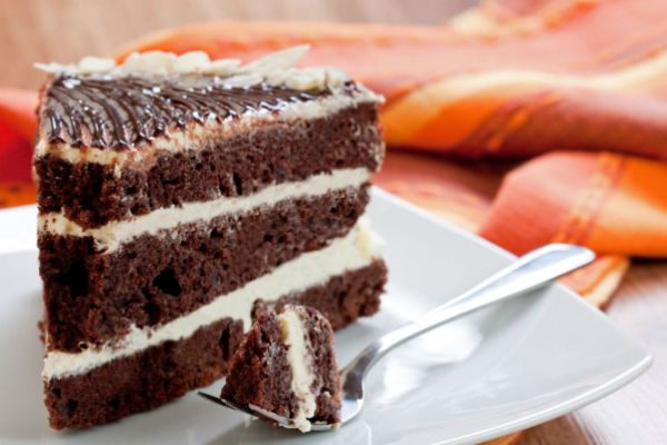 Для теста: 1 яйцо, 1 стакан сахара, 2-3 чайные ложки какао, 1 стакан кефира, 1 чайная ложка соды, 1 стакан муки. Для крема: 200 г. масла, 0,5 стакана сахара, 250 г. сметаны. Яйцо взбить с сахаром до густой пены, добавить кефир, соду и еще раз взбить. Затем добавить муку, тесто должно быть похоже на густую сметану. Вылить в смазанную жиром высокую форму и печь при температуре 180°С. Проверить готовность спичкой — воткнуть спичку в пирог, если она выйдет сыроватая, пирог допечь. Вытащить из формы и остудить на решетке, затем рзрезать торт на 2 коржа, смазать кремом, сверху украсить орехами, шоколадом.Приготовление крема: масло растереть с сахаром, добавить сметану и все взбить.Пирог с картошкой и мясом