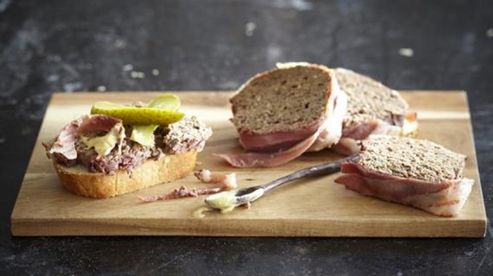 Вначале необходимо замочить хлеб в сливках, после чего превратить в фарш все мясные ингредиенты с добавлением чеснока. Смешать в одной посуде размокший хлеб, измельченные мясопродукты и яйца, всыпать соль и специи. Выложить в форму, смазанную маслом, приготовленную смесь. Перед запеканием поверх фарша рекомендуется уложить сливочное масло. Поместить форму с содержимым в раскаленную духовку на 1 час. Подавать блюдо можно на белом хлебе или в качестве отдельной закуски, нарезанной порционно.