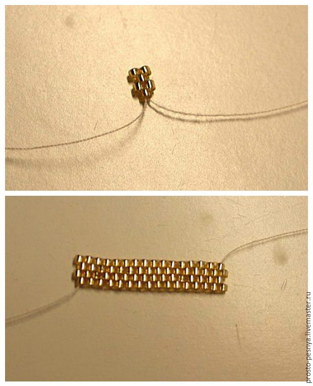 Ну и остается оформление верхушки. Здесь есть много разных способов. Эти кисточки я решила сделать торжественными и украсила их кольцом из бисера. Плести кольцо буду мозаичным плетением. Беру иголку с ниткой и бисер миюки делика. Узелок не завязываю, вместо этого оставляю 15 см нитки в самом начале. Набираю 5 бисеринок и плету полоску по схеме: