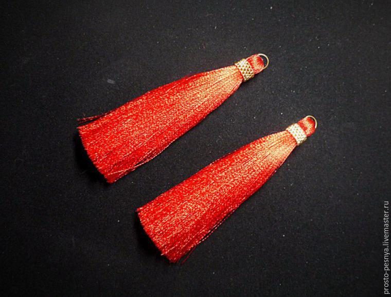 Наши торжественные кисточки готовы, и теперь можно с ними составить серьги. Пожалуй, я потом прикреплю их к фуллеренам из красного и золотистого жемчуга сваровски. У вас может быть масса своих вариантов :)