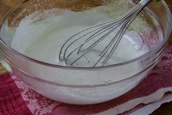 Когда большая часть пудры уже введена, немного сокращаю интервалы, примерно до 10 секунд и так ее всыпаю до конца. После этого, продолжаю взбивать массу до пышности и стойкости. Взбитая белковая масса будет отлично держать форму, а при переворачивании емкости не будет менять своего положения и тем более не выпадет из нее.