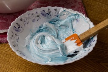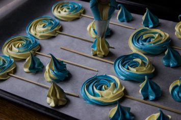 Меренга на палочке у меня будет двухцветной, поэтому я разделяю тесто на две части. Одну окрашиваю в синий (краситель лучше использовать гелевый или порошковый, не жидкий, чтобы не разжижать меренгу).