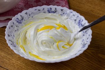 Такой клеящий крем не обязательно готовить заранее, если вы недавно готовили торт или десерт, просто отложите немного крема в баночку с крышкой и храните его холодильника до того момента, как будете склеивать пирожное меренги.