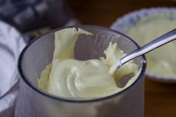 В данном рецепте мы будем выпекать рельефные круглые меренги, а затем будем скреплять их вместе на палочку. Иногда бывает сложно понять, чем можно склеить меренгу. В нашем простом рецепте будем использовать для этих целей обычный масляный крем, который подходит для тортов и других десертов. Для него вам потребуется: