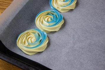 И поставить наши заготовки в духовку — сушиться при температуре 80-90 градусов (сложно сказать точнее, все духовки разные!) в течение примерно полутора часов. В зависимости от особенностей вашей духовки и размера безе вам может потребоваться больше или меньше времени. Я чуть переборщила с температурой, и местами появились небольшие трещинки, но не критичные. Вы же можете вовсе этого избежать, если правильно отрегулируете температуру либо если просто оставите меренги на столе до полного высыхания, однако для этого необходимо иметь запас времени, а в квартире должно быть не слишком влажно.