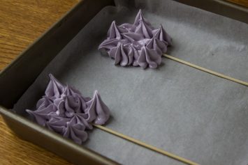 - Нужно выкладывать их на противень очень свободно, оставляя расстояние для палочек. Деревянные палочки помещаются в центр безе примерно на 2/3 ширины пирожных.