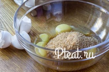 - В отдельную чашку разбить яйца и добавить 4 желтка. Всыпать сахар и венчиком или при помощи миксера взбить массу.