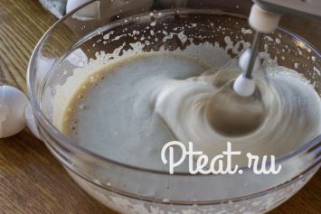 - Затем постепенно всыпаем сахар и продолжаем взбивать до образования пышной светлой, но не очень густой массы, 5−10 минут.