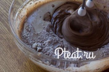 - Постепенно примерно в три приема вмешать смесь муки и какао в яичную смесь. Желательно это делать силиконовой лопаткой, мешать нужно снизу вверх от краев к середине и в одном направлении.