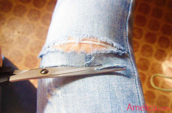 В любых джинсах есть слой белых ниток, которые находятся параллельно нижнему краю штанин. Перпендикулярно этим ниткам идет слой темных нитей. Их нужно подцепить и выдернуть, сначала по одной, потом можно пучками. По такому же принципу можно сделать красивые дырки в виде различных фигур, например, сердца.