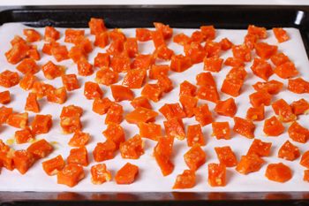 - Застелить противень рулонной фольгой. Сверху выложить проваренные цукатные кубики и отправить в слегка разогретую духовку на 8 минут.