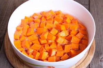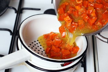 - На следующем этапе кубики оранжевого овоща сложить на сито и на два часа забыть о них, пока весь сироп не стечет полностью.