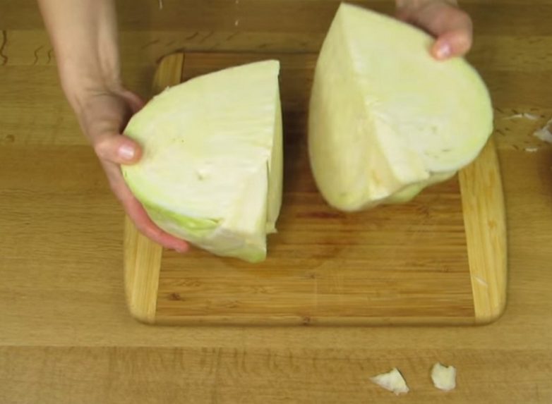 - Каждый кочан разрезать на две неодинаковые части так, чтобы в одной половине оставалась кочерыжка.