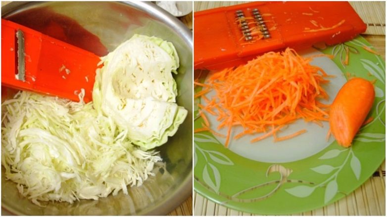 Нашинкуй капусту, предварительно отделив кочерыжки. Натри морковь на крупной терке.